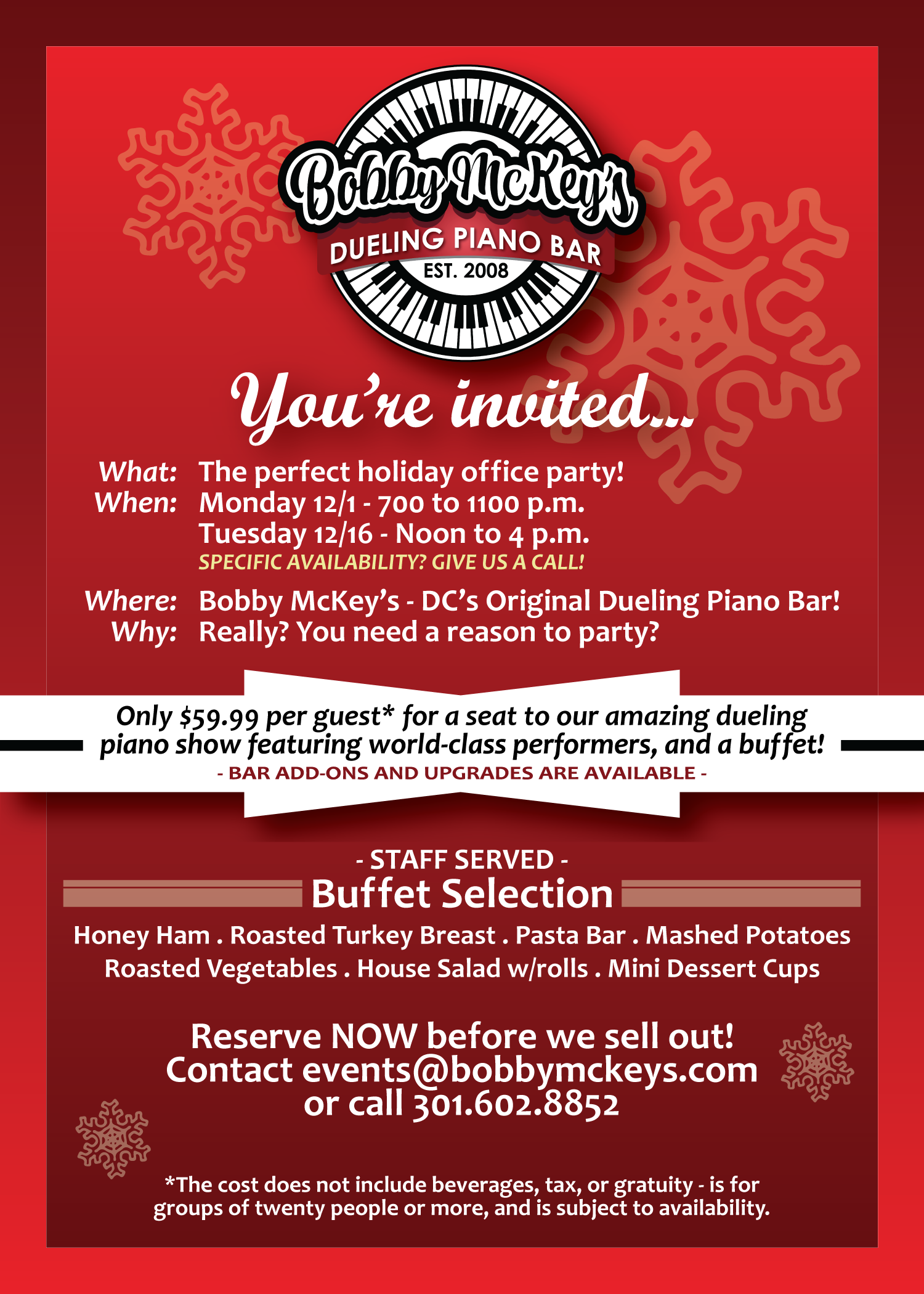 Host a one-of-a-kind holiday party at Bobby McKey's - DC's original dueling piano bar! Check out available dates and times for special event pricing with their holiday party packages.